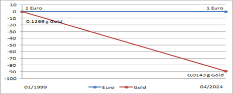 Benötigte man 1999 noch 0,1269 Gramm Gold, um einen Euro zu kaufen, sind es heute nur mehr 0,0143 Gramm.